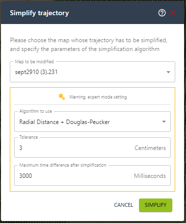 Warning, selecting parameters other than the default ones may lead to over-simplification, which will reduce the size of the map but significantly impact robot guidance accuracy.