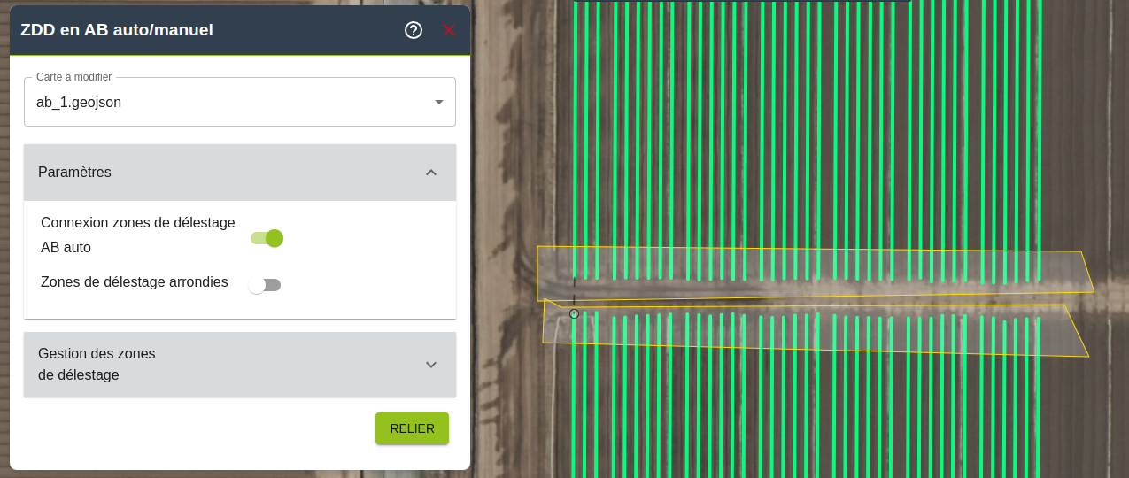 L’option ZDD en AB automatique se déclenche en activant le paramètre Zones de délestage arrondies puis en cliquant sur le bouton RELIER. L’option fonctionne en automatique ou en manuel en fonction du paramètre Connexion zones de délestage AB auto.