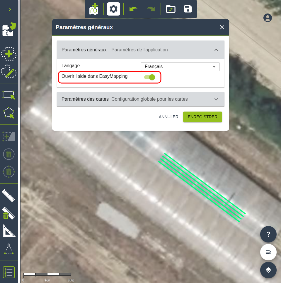 Les deux options sont sélectionnables dans le menu Paramètres, via l'option Ouvrir l'aide dans EasyMapping. Attention, il est nécessaire de sauvegarder les paramètres sélectionnés afin qu'ils soient pris en compte.