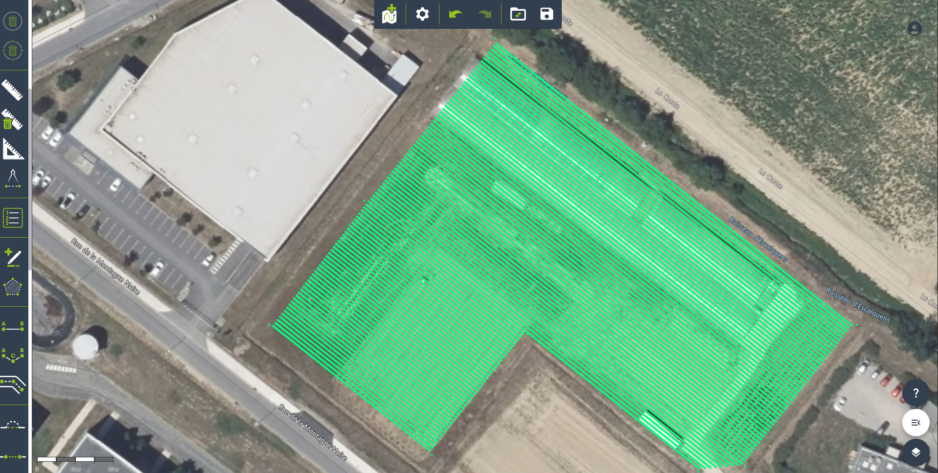 - Sélectionner les points qui sont mis en valeur avec un cercle bleu. Ces points doivent être sélectionnés dans l’ordre, de manière à créer un contour de parcelle à l’intérieur duquel les rangs seront créés à l’aide des paramètres précédemment fournis.